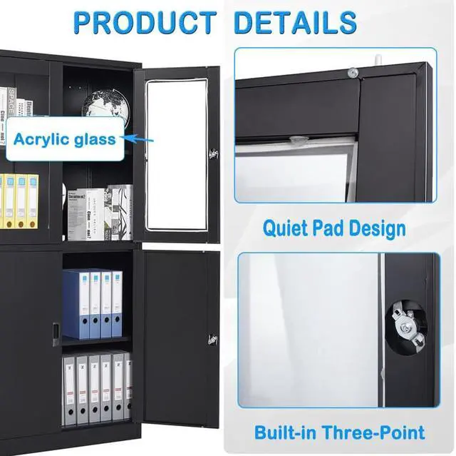 Storage cabinets is made of 5mm full steel, rugged and not easily deformed, plate adopted environmentally powder coated finish, capacity to resist corrosion and rust, the shelves cabinet can hold up to 120lbs, adjustable shelves convenience for your unique storage and organizing needs for office, home, garages, basements, archives, hospital, kitchen etc.