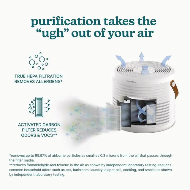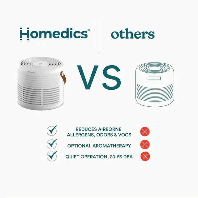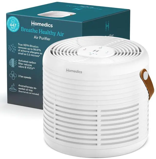 | Included Components | Homedics Air Purifier AP-T63, True HEPA filter with built-in prefilter and activated carbon odor filter, 3 essential oil pads, 3-year limited warranty |