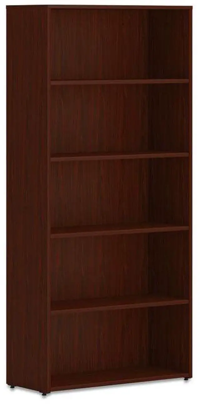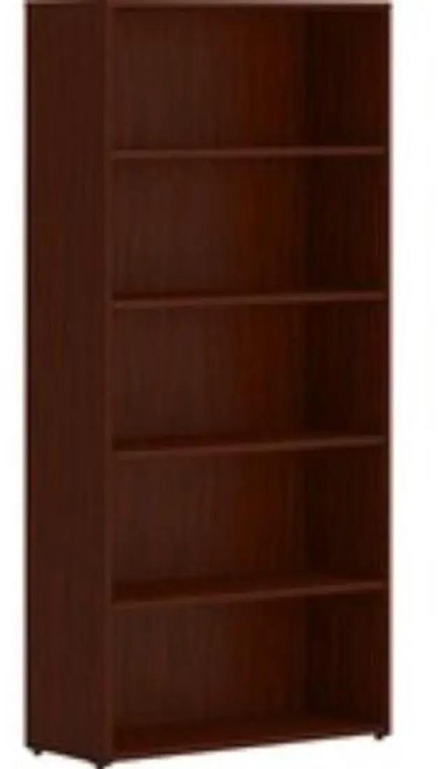 There is always beauty in simplicity, but with the Mod desk collection you'll also find variety and value. This Mod bookcase is a perfect addition to any work environment, with the ability to organize and display books, binders, and work materials. Three of the shelves are adjustable, offering the flexibility to store taller binders. It's totally productive. Totally adaptable. Totally Mod. Standard bookcase is made of woodgrain laminate and comes in traditional mahogany finish. Three adjustable shelves provide flexibility, and two fixed shelves add stability.