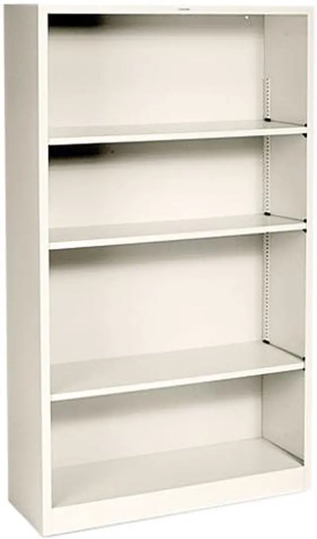 Eminently practical and useful steel bookcase offers long life with its heavy-duty construction. Heavy-gauge steel frame has a baked enamel finish over rust-inhibiting, phosphate pretreatment. Four shelves with generous depth hold plenty and are ideal for smaller spaces. Adjust the movable shelves in 1/2" increments to accommodate any size item. Putty-colored, four-shelf bookcase has 12-1/8" deep shelves, including the fixed bottom shelf. Each shelf holds up to 82 lb.
