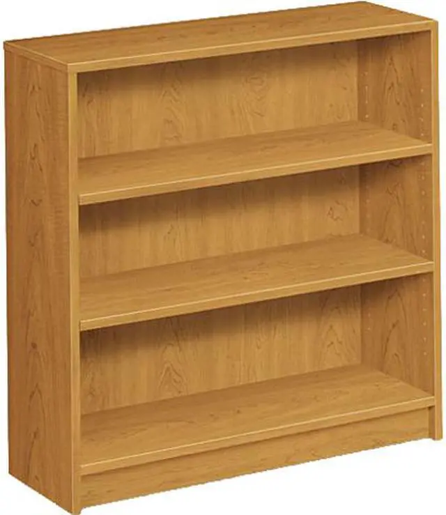 Three-shelf laminate bookcase features a square-edge profile and hardboard back panel. All surfaces (except outside of back) are finished in abrasion-resistant, thermal-fused, Harvest laminate over solid-core, high-density particleboard. Two of the 3/4" thick shelves are adjustable in 1-1/4" increments. The bottom shelf is fixed. Bookcase is designed for small office/home office applications. Cam-lock fasteners and wood dowels ensure pieces go together easily and precisely. Bookcase is equipped with four adjustable leveling glides. Meets or exceeds ANSI/BIFMA and ISTA performance standards.