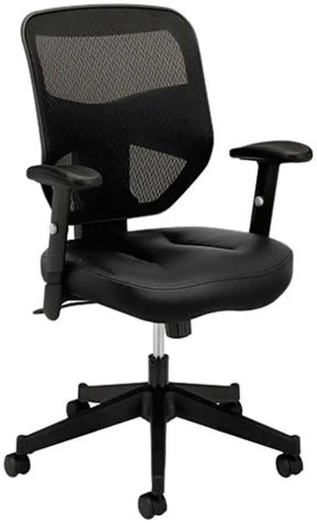 A waveform seat and height-adjustable padded arms give this chair an upscale feel at a compelling price. Seat upholstery is Black SofThread leather mesh. Back mesh, frame and base color is Black.