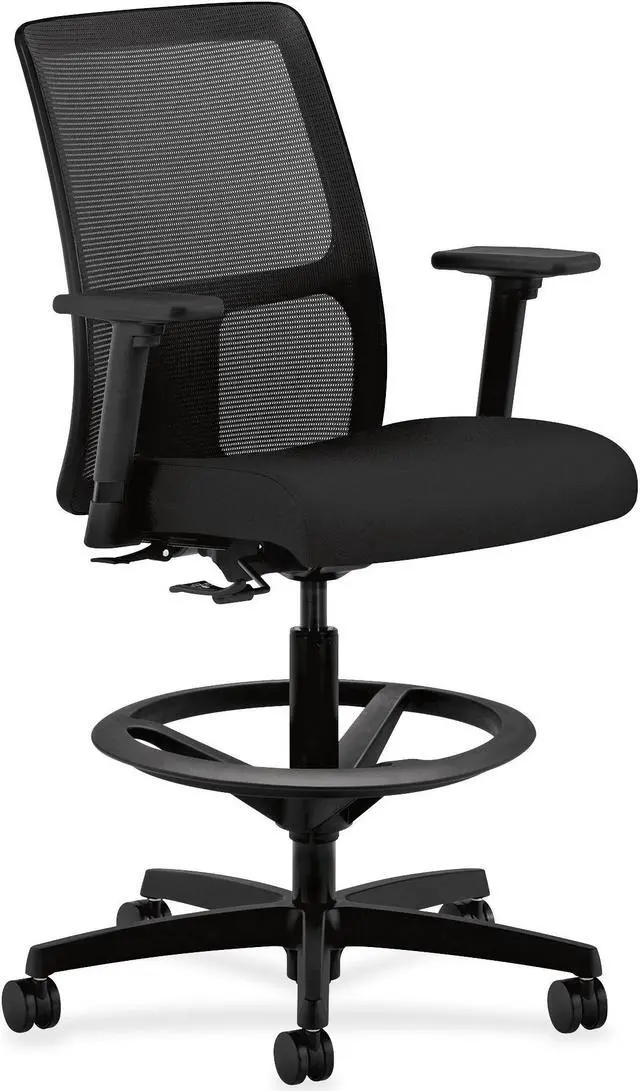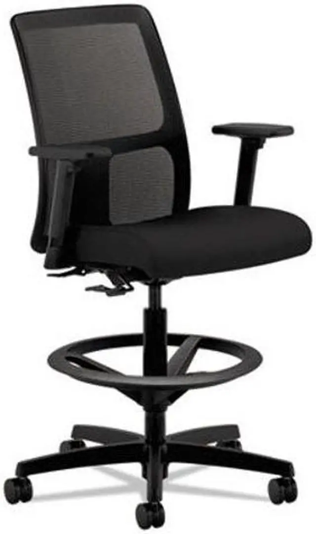 Ignition Series Stool gives you control over your domain with the ability to either sit or stand in an adjustable-height workstation, or bring people around standing-height collaborative tables. Make it personal with a contoured ilira-stretch mesh back, arms that adjust in height and width, and an adjustable footring. Mesh, frame and fabric upholstery on seat are black. Five-star base offers casters for easy movement. Functions include pneumatic seat-height adjustment, back-height adjustment and 360-degree swivel. Stool supports up to 300 lb. and meets/exceeds applicable ANSI/BIFMA standards.