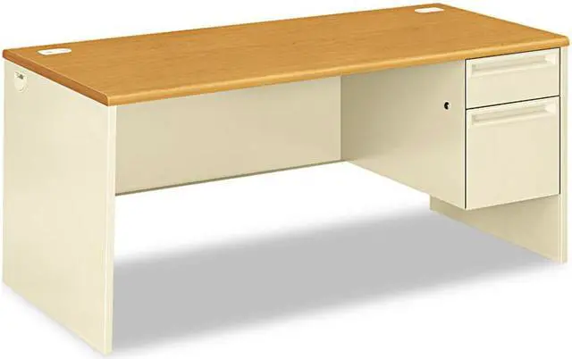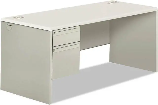 High-pressure laminate top is moisture-, scratch- and stain-resistant. Tru-fit mitered drawers operate on heavy-duty steel ball bearing suspensions. High-sided file drawer extends fully and accepts hanging files without hang rails; box drawer extends three-quarters. HON® "One Key" core removable locks. Two work surface grommets help control cord and wires. Three-quarter height modesty panel for privacy. Color: Silver Mesh/Light Gray; Pedestal Count: 1; Top Shape: Rectangular; Top Material: Laminate.