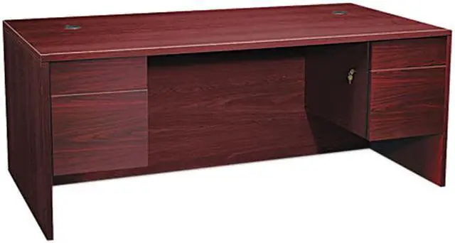 Hard-working, good-looking and built to survive a lifetime of overtime. Thermally-fused laminate top and end panels are abrasion- and stain-resistant. Drawers operate on ball bearing suspensions; file drawers extend fully and accommodate letter or legal size hanging files, box drawers extend three-quarters. HON One Key core removable locks make re-keying quick and easy. Full-height modesty panel for privacy. Two cord management grommets. Global Product Type - Desks-Standard & Executive Pedestal Desks Color - Mahogany Pedestal Count - 2 Top Shape - Rectangular Top Material - Thermally Fused Woodgrain Laminate Top Thickness - 1 1/8 Width Maximum - 72 Depth Maximum - 36 Height Maximum - 29 1/2 Pedestal Types - 3/4-Height Drawer Quantity - 4 Drawer Configuration - Left: Box/File Drawer Configuration - Right: Box/File Base Material - Woodgrain Laminate Edge Detail Profile - Square Edge Series Name - HON 10500 Series Compliance Standards - Level 2 Certified Compliance Standards - Meets or exceeds ANSI/BIFMA Standards Compliance Standards - SCS Indoor Advantage Gold Certified Pre-Consumer Recycled Content Percent - 69% Post-Consumer Recycled Content Percent - 3% Total Recycled Content Percent - 72% Footnote 1 - 10 1/2 conference overhang