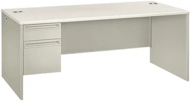 | Specifications | High-pressure laminate top is moisture-, scratch- and stain-resistant. Tru-fit mitered drawers operate on heavy-duty steel ball bearing suspensions. High-sided file drawer extends fully and accepts hanging files without hang rails; box drawer extends three-quarters. HON "One Key" core removable locks. Two work surface grommets help control cord and wires. Three-quarter height modesty panel for privacy. Pedestal Count: 1 Pedestal Types: 3/4-Height Drawer Configuration: Box/File Top Shape: Rectangular Top Material: Laminate Color: Silver Mesh/Light Gray Top Thickness: 1" Width Maximum: 72" Depth Maximum: 36" Height Maximum: 30" Drawer Quantity: 2 Caster/Glide/Wheel: Glides Base Material: Honeycomb,Steel Edge Detail Profile: Radius Edge Series Name: 38000 Series |