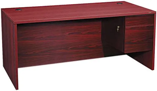Hard-working, good-looking and built to survive a lifetime of overtime. Durable abrasion- and stain- resistant laminate. Drawers operate on ball bearing suspensions; file drawer extends fully and accommodates letter or legal size hanging files, box drawer extends three-quarters. HON One Key core removable locks make re-keying quick and easy. Full-height modesty panel for privacy. Two cord management grommets. Desk and Return sold and shipped separately--ORDER BOTH. Global Product Type - Desks-Standard & Executive Pedestal Desks Color - Mahogany Pedestal Count - 1 Top Shape - Rectangular Top Material - Thermally Fused Woodgrain Laminate Top Thickness - 1 1/8 Width Maximum - 66 Depth Maximum - 30 Height Maximum - 29 1/2 Pedestal Types - 3/4-Height Drawer Quantity - 2 Drawer Configuration - Right: Box/File Base Material - Woodgrain Laminate Edge Detail Profile - Square Edge For Use With - HON 10500 Series Return Mahogany Series Name - HON 10500 Series Compliance Standards - Level 2 Certified Compliance Standards - Meets or exceeds ANSI/BIFMA Standards Compliance Standards - SCS Indoor Advantage Gold Certified Pre-Consumer Recycled Content Percent - 69% Post-Consumer Recycled Content Percent - 3% Total Recycled Content Percent - 72% Disclaimer Statement - Desk and Return sold and shipped separatelyORDER BOTH.