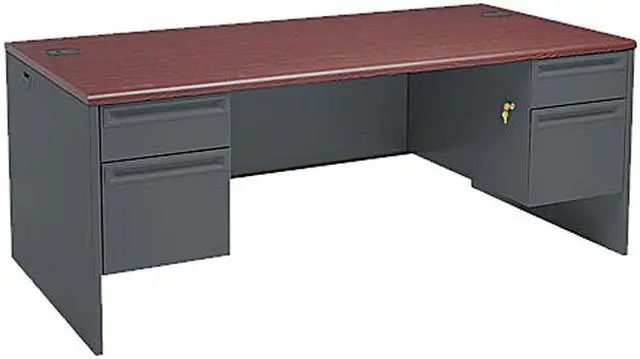 High-pressure laminate top is moisture-, scratch- and stain-resistant. Tru-fit mitered drawers operate on heavy-duty steel ball bearing suspensions. High-sided file drawers extend fully and accept hanging files without hang rails; box drawers extend three-quarters. HON One Key core removable locks. Two work surface grommets help control cord and wires. Three-quarter height modesty panel for privacy. Global Product Type - Desks-Standard & Executive Pedestal Desks Color - Mahogany/Charcoal Pedestal Count - 2 Top Shape - Rectangular Top Material - Steel-Reinforced High-Pressure Laminate Width Maximum - 72 Depth Maximum - 36 Height Maximum - 29 1/2 Pedestal Types - 3/4-Height Drawer Quantity - 4 Drawer Configuration - Left: Box/File Drawer Configuration - Right: Box/File Base Material - Metal Edge Detail Profile - Radius Edge For Use With - HON Center Drawer Charcoal Series Name - HON 38000 Series Compliance Standards - Level 2 Certified Compliance Standards - Meets or exceeds ANSI/BIFMA Standards Compliance Standards - SCS Indoor Advantage Certified Compliance Standards - SCS Indoor Advantage Gold Certified Pre-Consumer Recycled Content Percent - 30% Post-Consumer Recycled Content Percent - 17% Total Recycled Content Percent - 47%