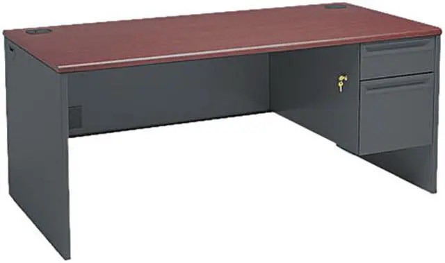 High-pressure laminate top is moisture-, scratch- and stain-resistant. Tru-fit mitered drawers operate on heavy-duty steel ball bearing suspensions. High-sided file drawer extends fully and accepts hanging files without hang rails; box drawer extends three-quarters. HON One Key core removable locks. Two work surface grommets help control cord and wires. Three-quarter height modesty panel for privacy. Global Product Type - Desks-Standard & Executive Pedestal Desks Color - Mahogany/Charcoal Pedestal Count - 1 Top Shape - Rectangular Top Material - Steel-Reinforced High-Pressure Laminate Width Maximum - 66 Depth Maximum - 30 Height Maximum - 29 1/2 Pedestal Types - 3/4-Height Drawer Quantity - 2 Drawer Configuration - Right: Box/File Base Material - Metal Edge Detail Profile - Radius Edge For Use With - HON 38000 Series Left Return Charcoal/Mahogany Series Name - HON 38000 Series Compliance Standards - Level 2 Certified Compliance Standards - Meets or exceeds ANSI/BIFMA Standards Compliance Standards - SCS Indoor Advantage Certified Compliance Standards - SCS Indoor Advantage Gold Certified Pre-Consumer Recycled Content Percent - 30% Post-Consumer Recycled Content Percent - 17% Total Recycled Content Percent - 47% Disclaimer Statement - Use freestanding or combine with Return to create an L Workstation.