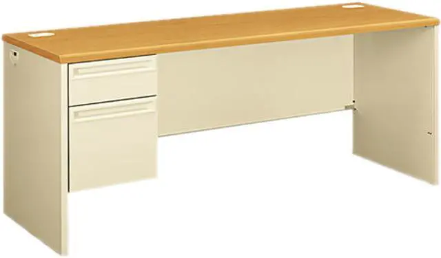 Steel frame with steel-reinforced, high-pressure laminate top for superior rigidity and strength. Drawers operate on heavy-duty steel ball bearing suspensions. High-sided, full-extension file drawer accepts hanging file folders; box drawer extends three-quarters. HON One Key core removable locks. Cord management with ports and hidden channels. Global Product Type - Credenzas-Single Pedestal Credenza Desk Color - Harvest Color - Putty Pedestal Count - 1 Drawer Configuration - Left: Box/File Overall Width - 72 Depth Maximum - 24 Overall Height - 29 1/2 Drawer Quantity - 2 Edge Detail Profile - Radius Edge Base Material - Metal Top Material - Steel-Reinforced High-Pressure Laminate Pedestal Types - 3/4-Height Series Name - HON 38000 Series Compliance Standards - Level 2 Certified Compliance Standards - Meets or exceeds ANSI/BIFMA Standards Compliance Standards - SCS Indoor Advantage Certified Compliance Standards - SCS Indoor Advantage Gold Certified Pre-Consumer Recycled Content Percent - 30% Post-Consumer Recycled Content Percent - 17% Total Recycled Content Percent - 47%