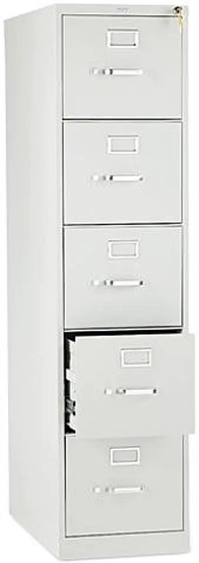 Five-drawer, vertical filing cabinet features a 26-1/2" case depth, label holders and a One Key core-removable lock kit. High drawer sides accept letter-size hanging folders without the use of hangrails. All drawers have thumb latches and three-part, telescoping, steel ball-bearing suspension. Spring-loaded, follower blocks keep files upright. Follower blocks have positive, slide-action positioning that is adjustable on 5/8" centers. Light gray vertical file has a baked enamel finish over rust-inhibiting, phosphate pretreatment. File is certified by SCS to be in compliance with specific, indoor, air-quality emission requirements and meets or exceeds applicable ANSI/BIFMA standards.