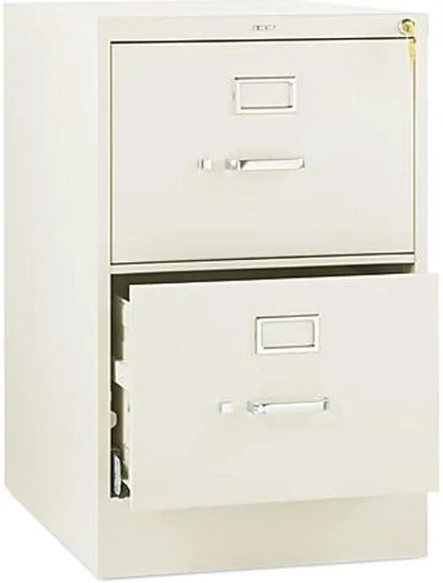 Full cradle drawer suspension with nylon rollers for smooth, quiet drawer action. Drawers open fully to provide easy access to entire drawer contents. High drawer sides eliminate the need for hangrails. An adjustable wire follower in each drawer keeps files upright and neat. HON One Key core removable lock installed. Global Product Type - File Cabinets-Vertical File Color - Putty Overall Width - 18 1/4 Overall Depth - 25 Overall Height - 29 Drawer Quantity - 2 Document Size Accommodation - Legal Material(s) - Steel Series Name - HON 510 Series Compliance Standards - Level 2 Certified Compliance Standards - Meets or exceeds ANSI/BIFMA Standards Compliance Standards - SCS Indoor Advantage Certified Compliance Standards - SCS Indoor Advantage Gold Certified Pre-Consumer Recycled Content Percent - 12% Post-Consumer Recycled Content Percent - 24% Total Recycled Content Percent - 36% Disclaimer Statement - Special Order: Requires additional lead time and cannot be returned. Disclaimer Statement -