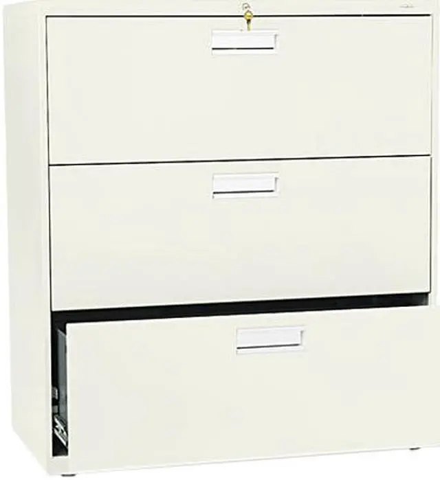 Well-engineered and incredibly strong, Brigade 600 Series lateral filing cabinets from HON are built for the demands of high-activity filing. This 36" wide, three-drawer file cabinet, in Putty, features a sturdy double-walled base to resist tampering while the all-weld case construction provides durability and strength. The clean, straightforward design compliments panel-based workstations and the compact footprint frees up office space. The two-sided lock mechanism resists tampering to ensure your files are safe. Drawer operation is made easy, and quiet, with the heavy-duty Steel ball-bearing drawer suspensions. Filing cabinets feature a built-in counterweight to stabilize it when a drawer is opened. To further prevent tipping risk, only one drawer can be open at a time. This filing cabinet is proudly made in the USA. This lateral file accepts letter or legal hanging file folders and is backed by the HON FULL Lifetime Warranty.