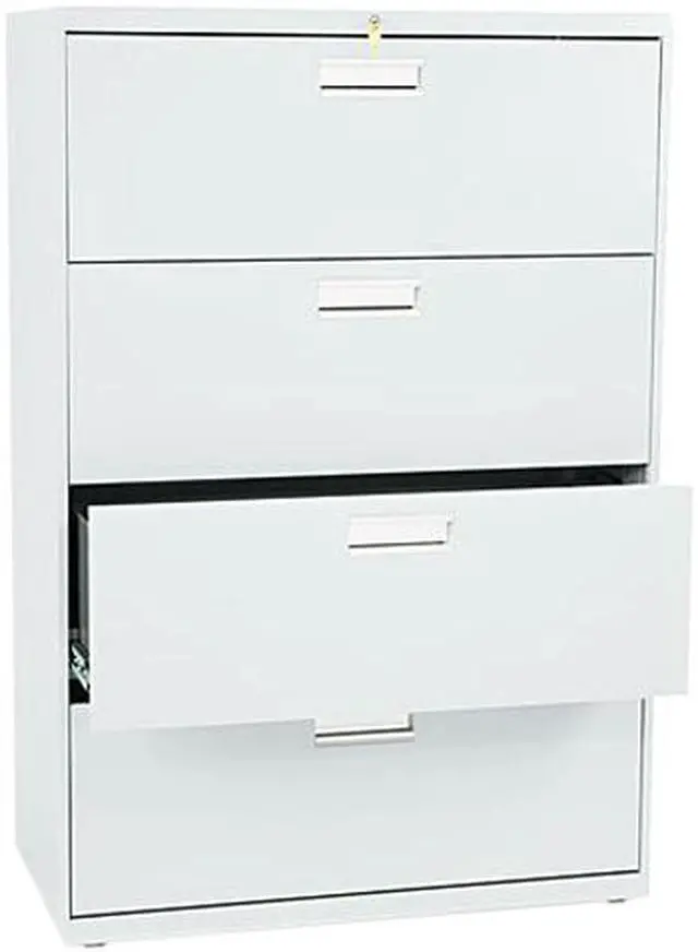 Four-drawer lateral file offers exceptional construction with double-walled base construction for maximum rigidity. Baked enamel finish over rust-inhibiting, phosphate pretreatment adds more durability. Telescoping, ball-bearing suspension delivers remarkably smooth drawer operation. Drawers accommodate letter-size or legal-size folders from side-to-side with included adjustable hangrails. Drawers are flush at the top and sides and feature drawer-extension restraint, plastic label holders and aluminum, recessed drawer pulls. Mechanical interlock allows only one drawer to open at a time. 36" wide lateral file also offers four adjustable leveling guides for stabilizing; HON One Key interchangeable, core-removable lock; and reinforced case steel construction. Lock mechanism secures both sides of drawers.