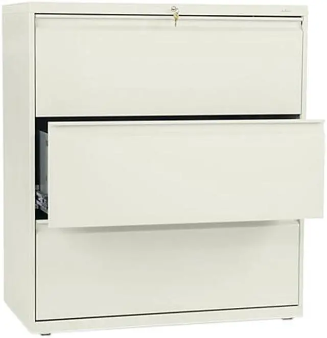 Three-drawer lateral file offers clean lines, reinforced case construction, 36" width, dual side locks for security, and full-width, designer-style handles with magnetic label holders. Baked enamel finish over rust-inhibiting, phosphate pretreatment adds more durability. Three-part, telescoping, ball-bearing suspension delivers smooth drawer operation. Drawers accommodate letter-size or legal-size folders from side-to-side with included adjustable hangrails. Drawers are flush at the top and sides and feature drawer-extension restraint. Mechanical interlock allows only one drawer to open at a time. Putty-colored lateral file also offers four adjustable leveling guides for stabilizing and HON One Key interchangeable, core-removable lock. Lock mechanism secures both sides of drawers.
