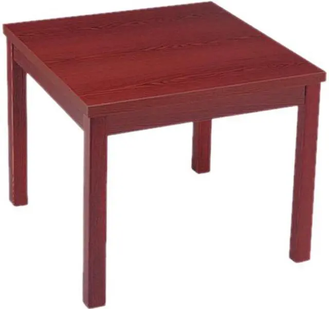 Sleek, contemporary styling that's durable. 2 thick honeycomb tops have a hollow core, making them extremely lightweight. Tops are abrasion- and stain-resistant thermal-fused laminate. Easy to assemble. Global Product Type - Tables-Reception Top Color - Mahogany Base Color - Mahogany Top Shape - Square Overall Width - 24 Overall Depth - 24 Height Maximum - 20 Top Material - High-Pressure Laminate Base/Leg Material - Wood Base Type - 4 Legs Compliance Standards - Level 2 Certified Compliance Standards - Meets or exceeds ANSI/BIFMA Standards Compliance Standards - SCS Indoor Advantage Certified Pre-Consumer Recycled Content Percent - 70% Post-Consumer Recycled Content Percent - 3% Total Recycled Content Percent - 73% Special Features - Corner Table Series Name - HON Laminate Occasional Tables