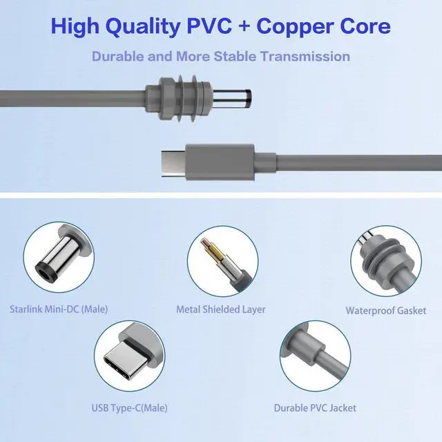 Superior Materials: The power cord is made of high-quality PVC composite material, featuring waterproof, flexible and resistant to bending, wear-resistant and durable, moisture-proof and temperature-resistant, high insulation, and aging resistance. It operates stably in various environments and is suitable for the portable power needs of the Starlink Mini.