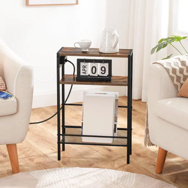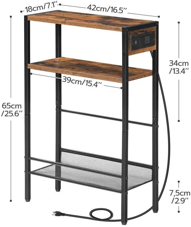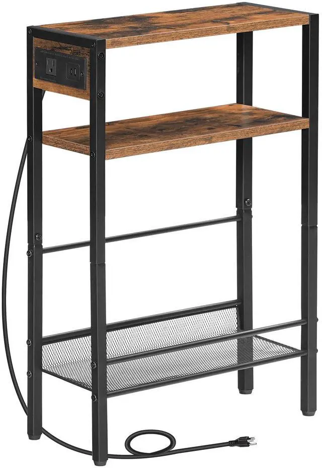 - Compact size makes it perfect for smaller spaces like apartments, dorms, etc. - 3-tier open design provides ample storage space. - Built-in power strip with 1 outlet and 1 USB port,1 Type C, easily charges your laptop, phone, etc. - Vintage and elegant appearance is suitable for your living room, bedroom, dining room, study, balcony, office, hallway, etc. - Adjustable feet enhance stability on uneven floors and protect the floor from scratches.