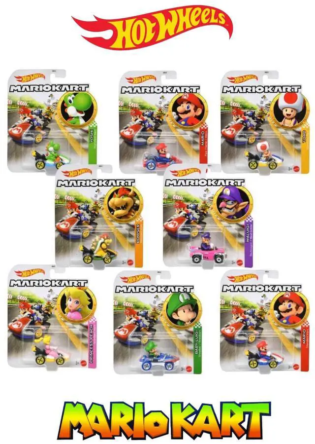 This set of 8 Mario Kart themed Hot Wheels vehicles delivers racing fun in a collectible 1:64 scale format. Each pack includes 8 randomly assorted die-cast cars inspired by the Mario Kart universe. Characters and vehicle designs are selected at random for an exciting unboxing experience. Detailed sculpting and bold graphics bring the racing action to life. Perfect for collectors fans of Mario Kart and Hot Wheels racing play.