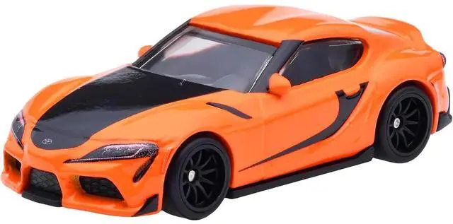 This Hot Wheels Fast & Furious 9 die cast model features the modern 2021 Toyota GR Supra in a bold orange finish. The design includes realistic contours and authentic styling inspired by the cars appearance in the Fast & Furious franchise. Made with durable die cast metal, it is suitable for collectors, display, and Hot Wheels racing play. Its 1:64 scale makes it easy to store and compatible with standard Hot Wheels track systems. A perfect addition for fans of modern sports cars and movie inspired collectibles.