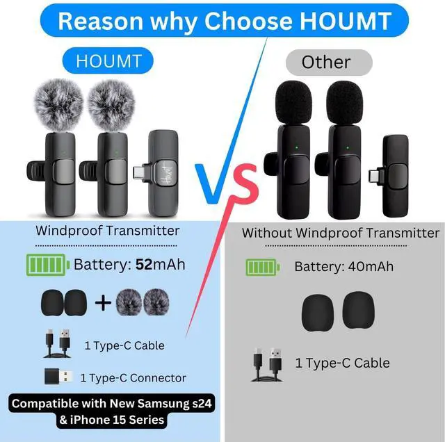 - New Device Compatibility: Houmt flawlessly connects and compatible with the latest Samsung s24 and iPhone 15 Series, while the "Other" microphone does not.