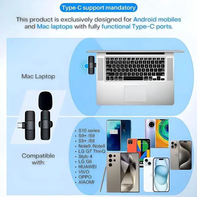 This Type-C wireless lavalier microphone is compatible with a wide range of Type-C mobile devices, including popular brands like Samsung, Apple, Google, Huawei, Xiaomi, OnePlus, Oppo, Vivo, Sony, LG, Motorola, Asus, Lenovo, and Nokia, as well as MacBook with a Type-C port, ensuring clear and easy sound capture.