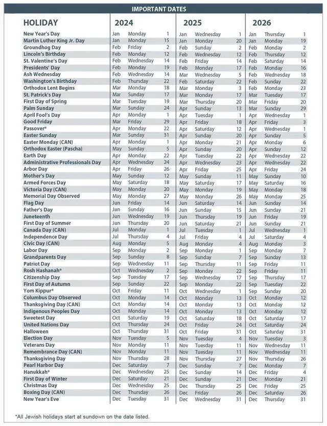 • Separate Sections: Phone Messages; Reminders; Three-Year Reference Calendar Page; Three-Year Holiday List