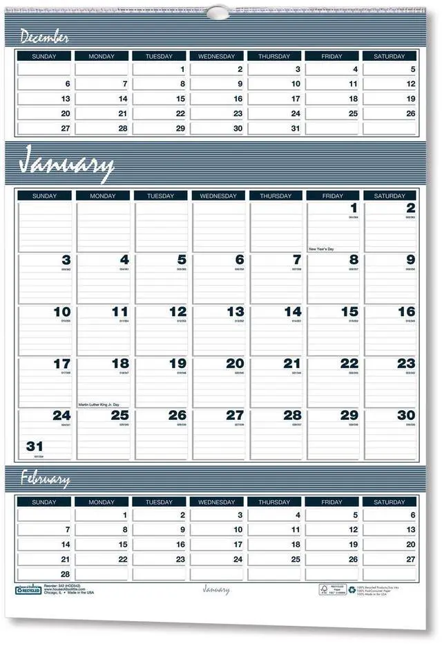 Bar Harbor Recycled Wirebound 3-Months-per-Page Wall Calendar 15.5 x 22 White/Blue/Gray 14-Month: Dec 2025 to Jan 2027 343