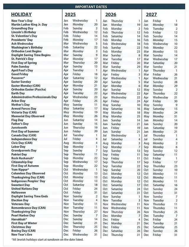 • Separate Sections: Three-Year Calendar Reference Page;Three-Year Column List of Holidays