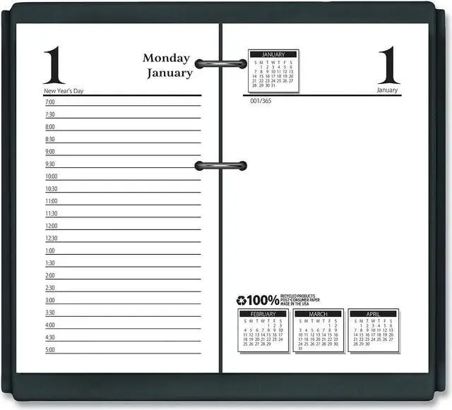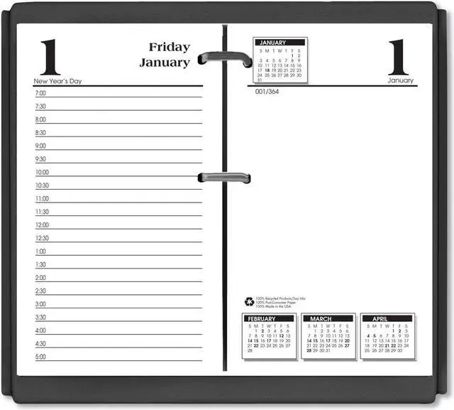 One weekday per two-page spread. One page each Sat. and Sun. Ruled for half-hour appointments 7 AM to 5 PM, Mon.-Sat. and 9 AM to 5 PM, Sun. Four-month reference calendar. Printed with blue soy ink. Fits any #17 base, sold separately. Made entirely of recycled materials.