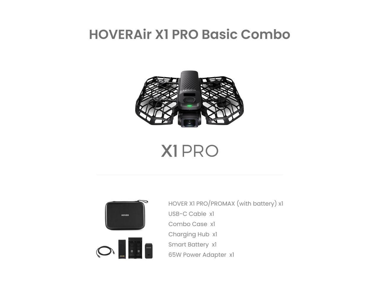The X1 PRO is a powerful, compact flying camera with 4K resolution for high-definition captures. It delivers ultimate flight performance with smooth stabilization, various automated flight modes, and enhanced follow functions. Designed for easy use, it features a pocket-sized foldable design, palm takeoff, OmniTerrain capability, and rear collision detection for safe, stable flights in diverse conditions. The Basic Combo includes the HOVERAir X1 PRO (with battery), USB-C Cable, Combo Case, Charging Hub, Smart Battery, and 65W Power Adapter.