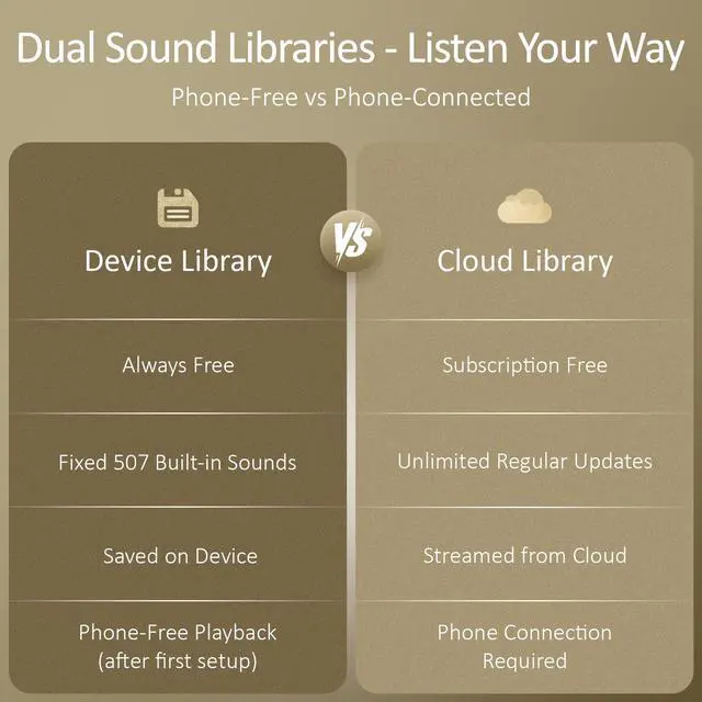 Free fixed sounds that can be saved on the device for phone-free playback after the initial setup.