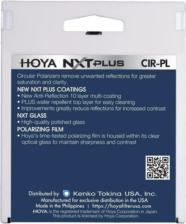 A Circular Polarizer is the must have filter for every photographer and Hoya's NXT Plus is a powerful upgrade to the best-selling NXT series. The new filter employs a waterproof top-coat to Hoya's polished smooth "Clear" glass for easy cleaning. Dirt, smudges and water wipe away easily. Using 10 layers of Hoya's patented anti-reflection (AR) multi-coatings your images show improved contrast, color and sharpness. The polarizing film is optical thin with a filter factor of 1.72 for faster AF and improved viewing over standard PL films.