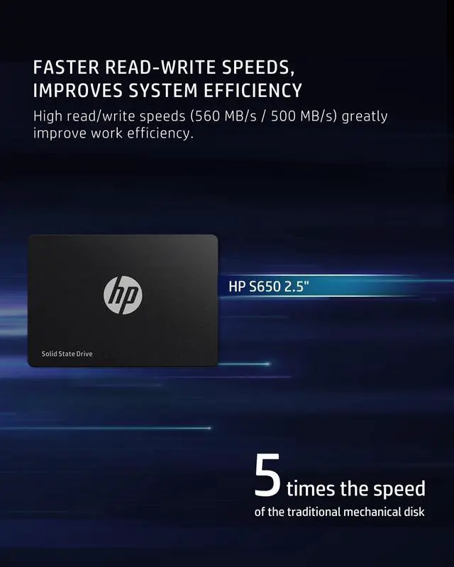 HP S650 2.5" SSD adopts SATA III 6 GB/s interface, and offers a maximum capacity of up to 1.92 TB. A great upgrade for desktops / laptops, S650 is built with a high-performance controller and high-quality 3D NAND to bring you performance, stability and reliability, all together.