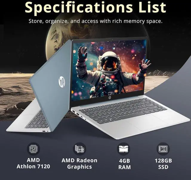 The HP 14" HD Business Laptop offers smooth, efficient performance with AMD Athlon 7120 and Radeon graphics.