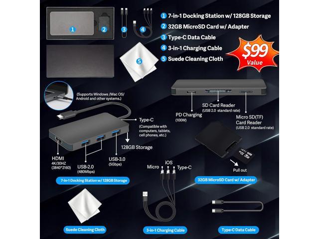 - Bonus Docking Station Set:1x 7-in-1 Docking Station w/ 128GB SSD, 1x 32GB MicroSD Card w/ Adapter, 1x Type-C Data Cable, 1x 3-in-1 Charging Cable, 1x Suede Cleaning Cloth.