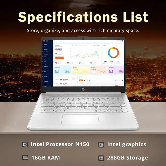 14" Anti-glare HD Display14-inch diagonal, HD (1366 x 768), micro-edge, anti-glare display. ^^Intel N150 ProcessorThe low voltage design optimizes energy usage, allowing you to stay productive and entertained with great efficiency. ^^HD CameraHP True Vision 720p HD camera with temporal noise reduction and integrated dual array digital microphones. Provides high quality video calls, virtual meetings and online interactions. Intel GraphicsAchieve reliable visual performance for everyday computing tasks, delivering crisp visuals and efficiently handling multimedia content on our laptops. ^^Windows 11 SExperience the most secure Windows ever built with fast boot times, increased responsiveness, and added protection against phishing and malware.