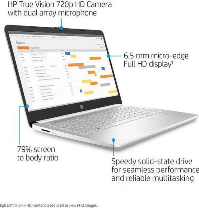 Designed to keep you productive and entertained from anywhere, the HP 14 inch laptop combines long-lasting battery life with a thin and portable, micro- edge bezel design. With its thin and light design, 6.5 mm micro-edge bezel display, and 79% screen to body ratio, you can take this HP laptop computer anywhere and see more. The Full High Definition screen has virtually no bezel encircling the display for an ultra-wide viewing experience that provides for seamless multi-monitor set-ups. Intel UHD Graphics give you smooth 4K content for streaming or playing your favorite games.