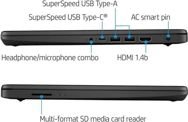 External ports: 1 USB Type-C 5Gbps signaling rate (supports data transfer only and does not support charging or external monitors); 2 USB Type-A 5Gbps signaling rate; 1 AC smart pin; 1 HDMI 1.4 b; 1 headphone/microphone combo
