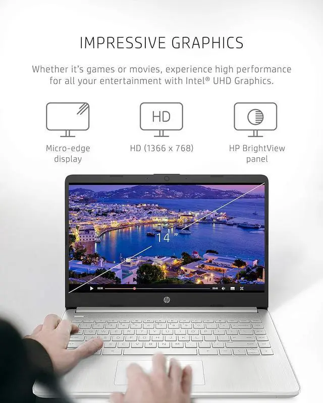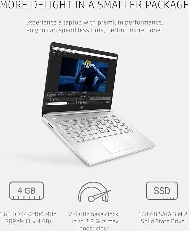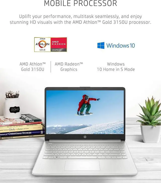 Stay productive and entertained from anywhere with the HP 14 Laptop. Take this PC on-the-go with its thin and light design, and enjoy a maximized viewing area thanks to the slim bezel. All your content runs smoothly and looks amazing on an HD display with AMD Radeon Graphics. Tackle your busiest days and handle all your complex tasks at once with the powerful AMD Athlon Gold 3150U Mobile Processor and with 4 GB RAM. It's just performance that your laptop computer boasts, but also 128 GB of Solid-State Drive storage for storing all your favorite memories and important documents.
