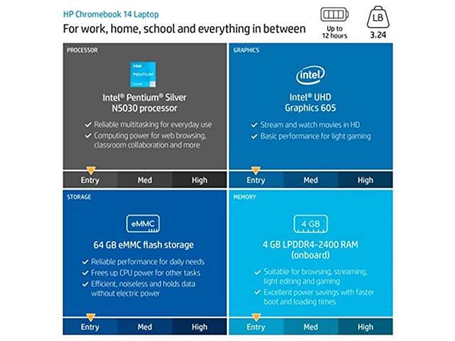 HP Chromebook 14" 4GB LPDDR4, 64GB eMMC Flash Intel Pentium Silver N5030, Intel UHD Graphics 605, Chrome OS, Silver (14A-NA0131WM)