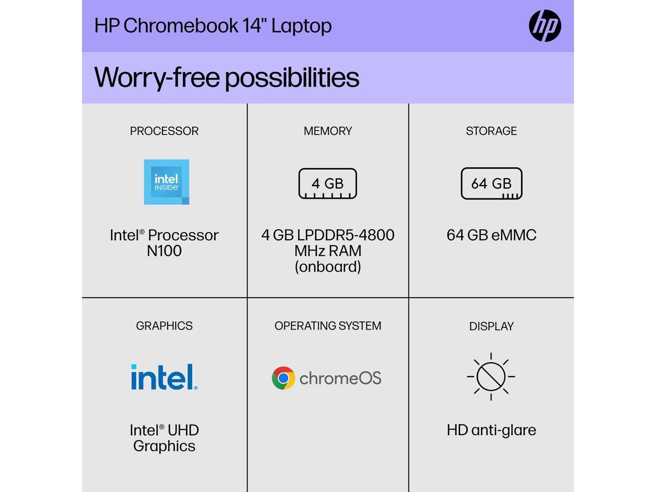 HP Chromebook 14a-nf0010nr 14" HD Laptop, Intel N100 0.8GHz, 4GB RAM, 64GB eMMC, ChromeOS, Sky Black