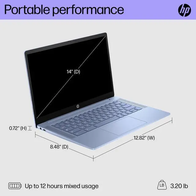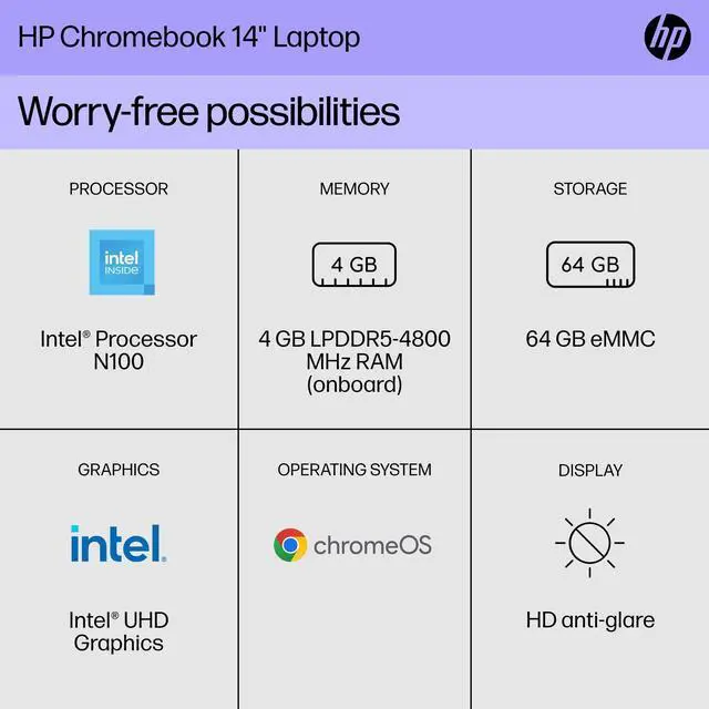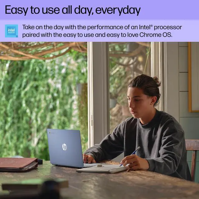 Worry-free performance and entertainmentStay productive and worry-free with the HP Chromebook 14", packed with the performance of up to an Intel processor and the easy to use Chrome OS. Do more with plenty of memory, faster speeds, and wireless connectivity and enjoy faster boot and long battery life with HP Fast Charge so you can stay connected all-day. Easy to use all day, everydayTake on your day with up to an Intel Processor, easy to use Chrome OS and plenty of storage and memoryConnect with ease and confidencePresent your best self with the high quality camera, easy access microphone, and webcam switch for added privacy.