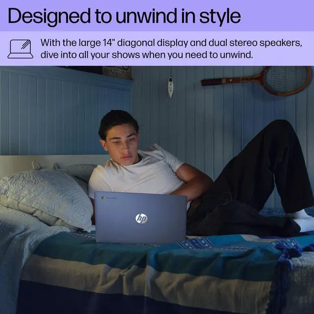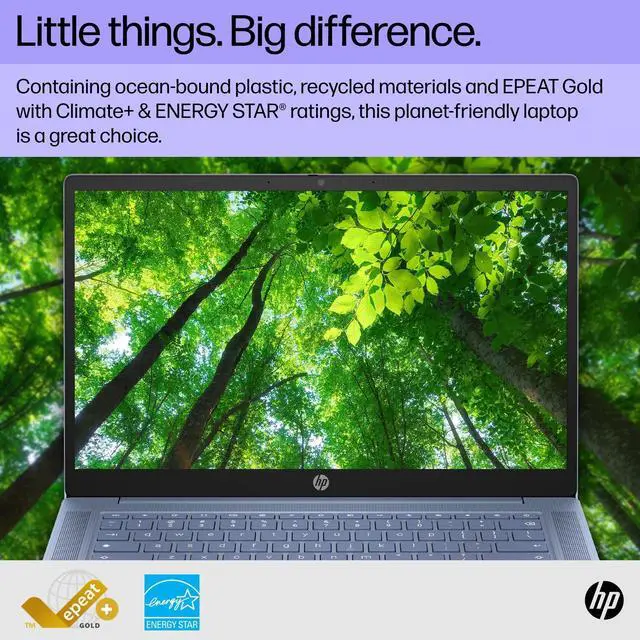 Designed to unwind in styleDive into your favorite shows with the large 14"display, dual stereo speakers, and wireless connectivity. Sustainability in action - Built for a better tomorrowDesigned to be more sustainable using ocean-bound plastic, post-consumer recycled materials. Featuring Intel processorGet the performance and graphics you need with an Intel processor at the affordability you want to connect, learn, and play anywhere. Intel UHD GraphicsSmoothly stream 4K content and play your favorite games in 720p, without the need for a dedicated graphics card. With excellent Intel UHD graphics performance, you'll see the difference in everything you do.
