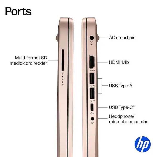 1 USB Type-C (5Gbps signaling rate), 2 USB Type-A (5Gbps signaling rate), 1 Headphone/microphone combo, 1 AC smart pin, 1 HDMI 1.4b