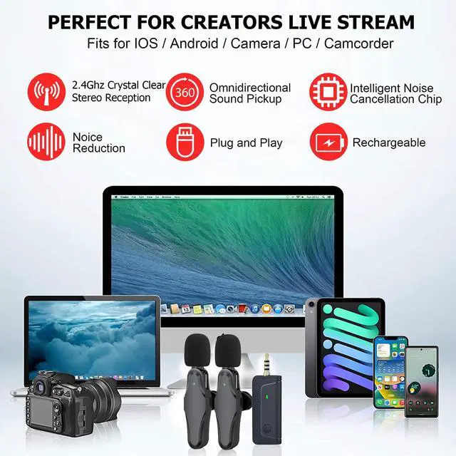 The VidPro wireless lavalier microphone set allows two people to record high-quality audio simultaneously with crystal-clear sound. Operating on a 2.4GHz frequency with a 60-foot range, it comes with a 3.5mm plug and includes TTRS, Lightning, and USB-C adapters for compatibility with cameras, smartphones, and other devices. This set is ideal for interviews, vlogging, podcasts, and video production.