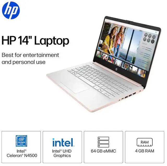 HP 14" LAPTOP - INTEL CELERON N4500 2021 - 4GB MEMORY - 64GB EMMC - PALE ROSE GOLD + SPLASH PROOF LAPTOP BAG + SANDISK CRUZER BLADE USB FLASH DRIVE - 128GB HP 14" Laptop - Intel Celeron N4500 2021 - 4GB Memory - 64GB eMMC - Pale Rose Gold This laptop is designed to keep you productive and entertained, featuring a long battery life and a thin and portable design. Microsoft Copilot AI assistance helps you work smarter and find answers faster. Give work presentations a boost with the included one-year subscription to Microsoft 365 applications. Enjoy high-quality, clear video calls with the HD camera.