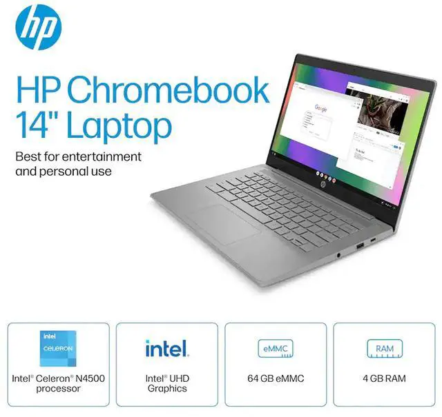 Responsive performance and all the Google features you love. Stay productive and entertained with the HP Chromebook 14. Powered by an Intel Processor and ample storage, its perfect for work and fun, with built-in Google apps and other popular apps. Enjoy HD video calls, streaming, and gaming on the micro-edge display, plus worry-free performance with automatic updates and built-in security.