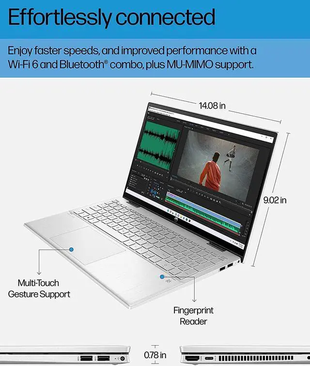 2 SSD storage (5) (6) for the bandwidth you crave and plenty of room for your files and photos. This touchscreen laptop takes work and play to new levels with up to 8 hours and 30 minutes of battery life (7). Plus, enjoy quicker recharges as HP Fast Charge takes your device from 0 to 50% power in 45 minutes (8). With Windows 11, your PC laptop gives you a whole new perspective as you connect, game, and create in new ways (9). Experience reliable internet speeds with a Wi-Fi 6 (2x2) and Bluetooth® 5.2 combo (10) (11) and enjoy modern connectivity options with a SuperSpeed USB Type-C® (12), two SuperSpeed USB Type-A, DisplayPort 1.4, HDMI 2.1, and a headphone/microphone combo.