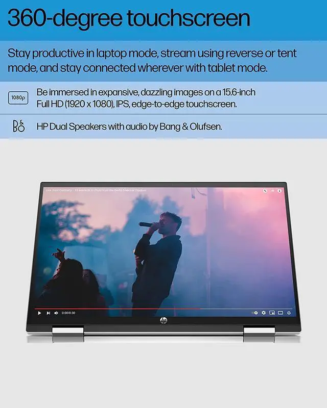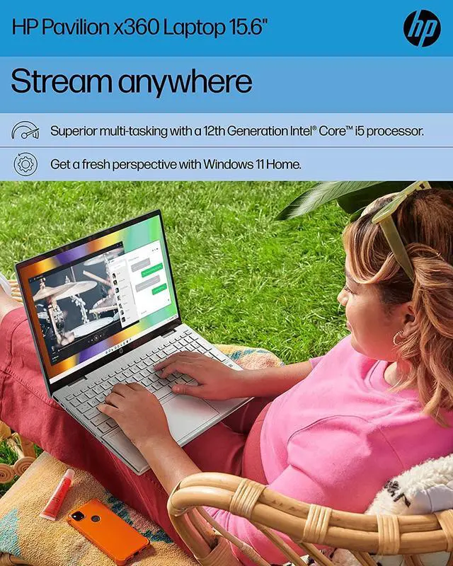 Stream any way and everywhere you want with the super-flexible HP Pavilion x360 Convertible Laptop. See all of your content unobstructed on an edge-to-edge, 1080p, IPS touchscreen (2). Stay comfortable no matter what angle you view the screen, thanks to its 360-degree hinge, enabling four distinct viewing positions. Plus, DC Dimming technology lets you view your favorite shows or movies without added eyestrain (1). Enjoy reliable multitasking and incredible graphics thanks to the 12th Generation Intel® Core i5-1235U processor and Intel® Iris® Xe Graphics (3) (4). Your devices hardware continues to impress with 12 GB of RAM and 256 GB PCIe® NVMe M.